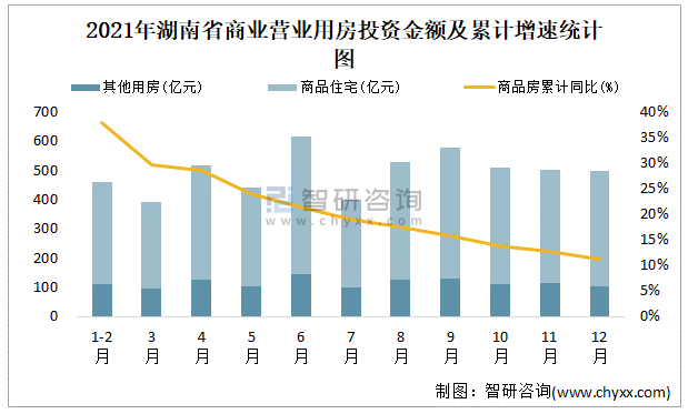 根據國家統計局數據統計可知:2021年12月湖南省房地產開發投資商品房投資金額為495.94億元,其中包括辦公樓、商業營業用房等其他用房102.82億元(注:辦公樓、商業營業用房未分開統計);2021年湖南省房地產開發投資包括商業營業用房在內的其他用房累計金額為1263.22億元。