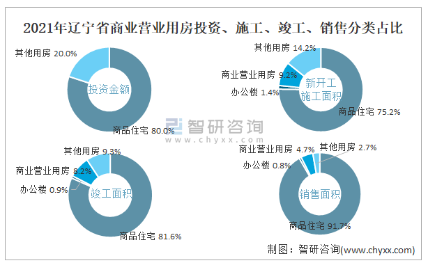 根據國家統計局數據統計可知:2021年遼寧省房地產開發企業在包括商業營業用房在內的其他用房投資金額占比為20%(注:只有投資金額中其他用房包含辦公樓、商業營業用房),商業營業用房的新開工面積與竣工面積所占比重差異不大,從銷售面積來看,商業營業用房銷售面積占比高于辦公樓銷售面積占比。