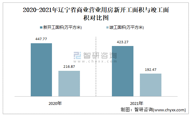 2020-2021年遼寧省商業營業用房新開工面積與竣工面積對比圖