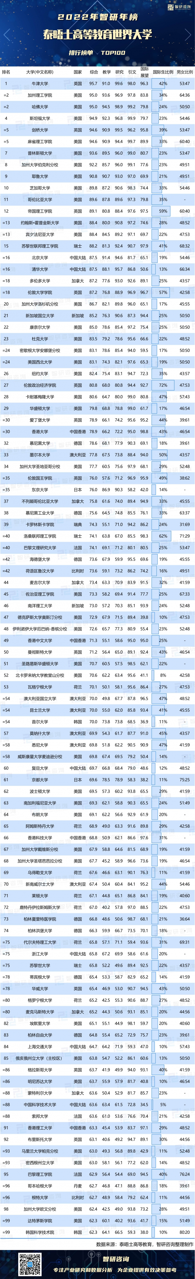 9月2日,泰晤士高等教育公布了“2022年度世界大學(xué)排名”,排名以教學(xué)、研究、研究影響力和國(guó)際展望等多項(xiàng)指標(biāo)衡量大學(xué)綜合實(shí)力,智研咨詢數(shù)據(jù)中心推出《智研年榜:2022年泰晤士高等教育世界大學(xué)排行榜單TOP100》,以供參考。