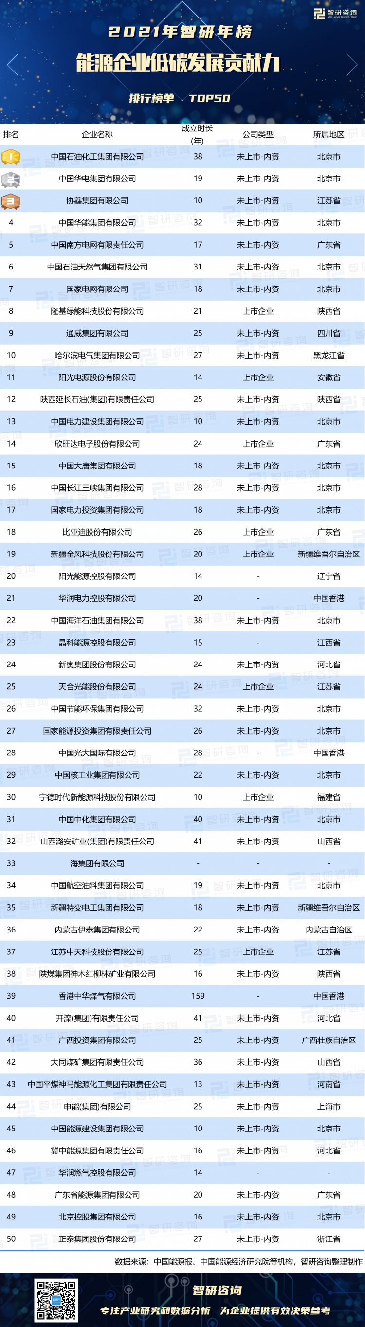 依據榜單可知:1)中國石油化工集團有限公司、中國華電集團有限公司、協鑫集團有限公司、中國華能集團有限公司、中國南方電網有限責任公司位于榜單前5,其中有38年歷史的中國石油化工集團有限公司憑借最大貢獻力排名第一,榜單能源企業最少成立年限也達到了10年之久,有著159年歷史的香港中華煤氣有限公司躍進榜單前40,僅成立10年的協鑫集團有限公司低碳貢獻力已超越許多企業,位于榜單第3;2)榜單企業以內資企業為主(35家),上市企業有8家,榜單前7位的能源企業均屬于內資企業;3)50家企業所在地主要分布在北京市(17家)、廣東省(4家)、江蘇省(3家),前2家能源企業均分布在北京市。