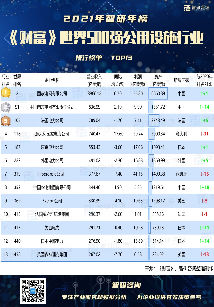 2021年《財富》世界500強公用設施行業排行榜:中國3家企業上榜,榜單前3中占有2席(附年榜TOP13詳單)