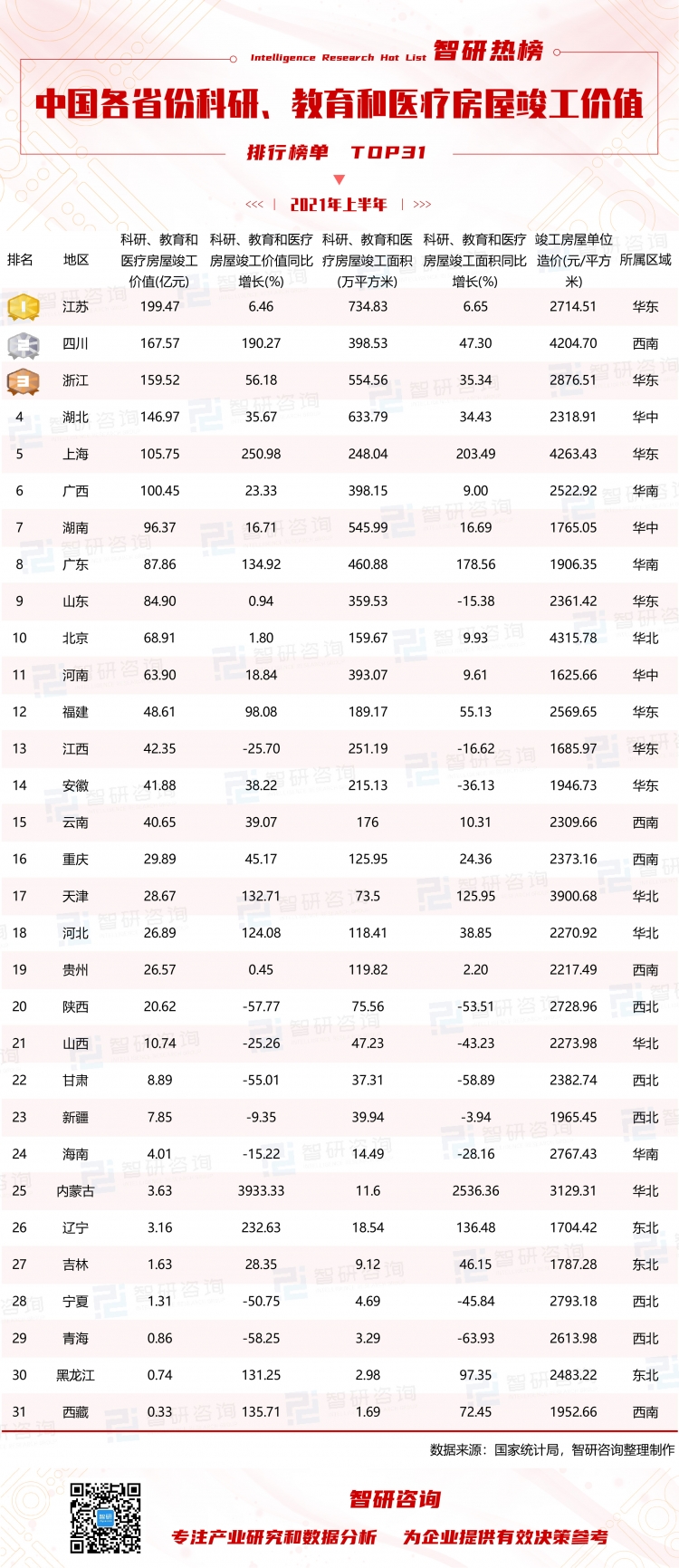 依據榜單可知,江蘇以199.47億元的科研、教育和醫療房屋竣工價值排名第一,占總竣工價值的12.23%,四川緊隨其后,科研、教育和醫療房屋竣工價值高達167.57億元,同比增長了190.27%;從科研、教育和醫療房屋竣工價值同比來看,23個省市科研、教育和醫療房屋竣工價值同比有不同程度的增長,內蒙古同比增長最多(3933.33%),排名第25位,其次是上海同比增長了250.98%,排名第5。