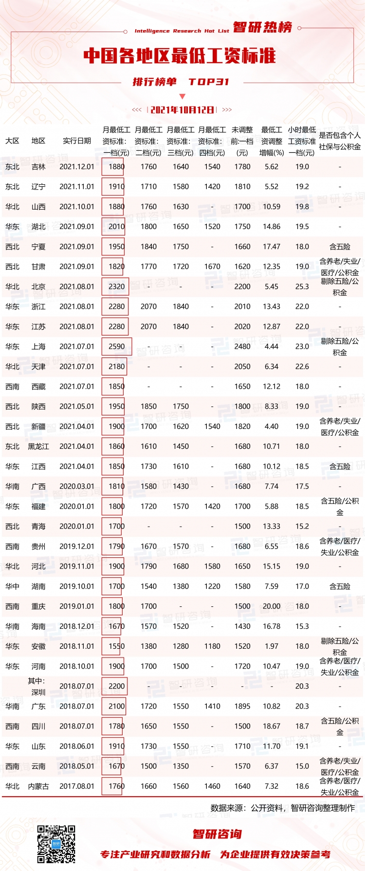 2015年人力資源和社會(huì)保障部下發(fā)通知,要求在今后一段時(shí)間內(nèi),最低工資標(biāo)準(zhǔn)每?jī)赡曛寥曛辽僬{(diào)整一次。今年,中國(guó)多個(gè)地區(qū)發(fā)布了上調(diào)最低工資標(biāo)準(zhǔn)公告,為研究中國(guó)各地區(qū)最低工資標(biāo)準(zhǔn)相關(guān)情況,智研咨詢(xún)數(shù)據(jù)中心以各地最低工資標(biāo)準(zhǔn)的實(shí)行日期為排序依據(jù),推出《智研熱榜:2021年中國(guó)各地區(qū)最低工資標(biāo)準(zhǔn)排行榜單TOP31》,以供參考。