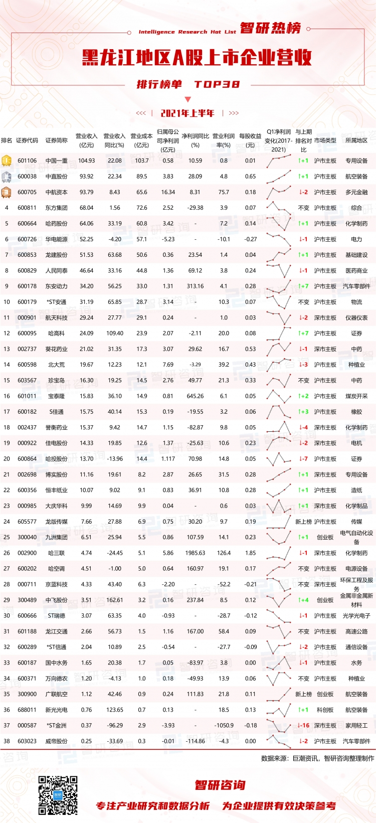 2021年上半年黑龍江地區上市企業TOP38榜單中,中國一重營收為104.93億元,同比上升了22.08%,占整個黑龍江地區營收的11.64%;上市企業營收同比中,有31家上市企業營收同比有所上升,7家上市企業營收同比有所下降,中飛股份營收同比增長最多(162.61%),*ST金洲營收同比下降最多(96.29%);與上期排名相比,7家上市企業排名不變,14家上市企業排名有所上升,15家上市企業排名有所下降,哈高科排名上升最多,上升了7位,*ST金洲排名下降最多,下降了16位,龍版傳媒、廣聯航空這2家企業新上榜。