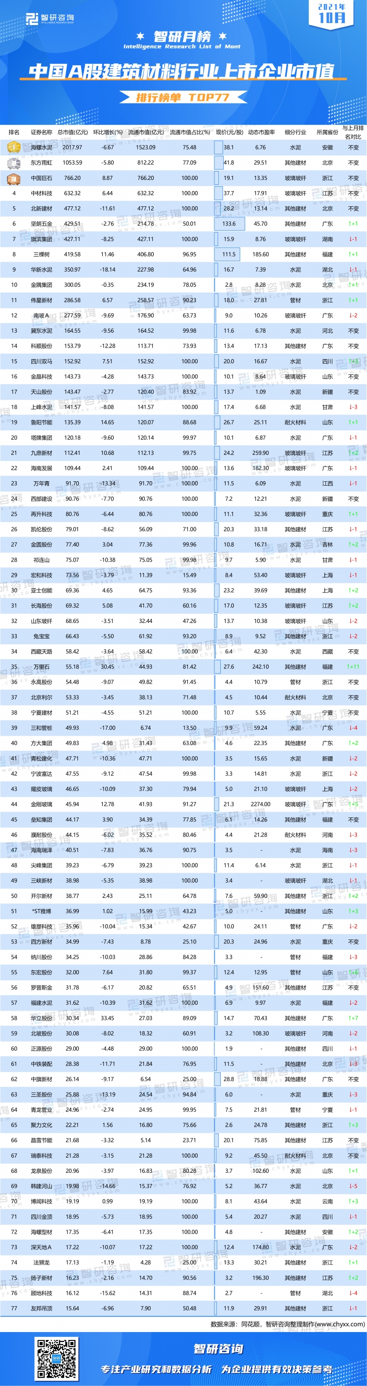 與9月A股建筑材料行業上市企業總市值排名相比,24家企業排名上升,萬里石升幅最大,提高11個名次升至第35;33家企業排名小幅下滑,水泥企業韓建河山降幅最大,下降5個名次跌至第69;包括前5強企業在內的20家企業排名不變。