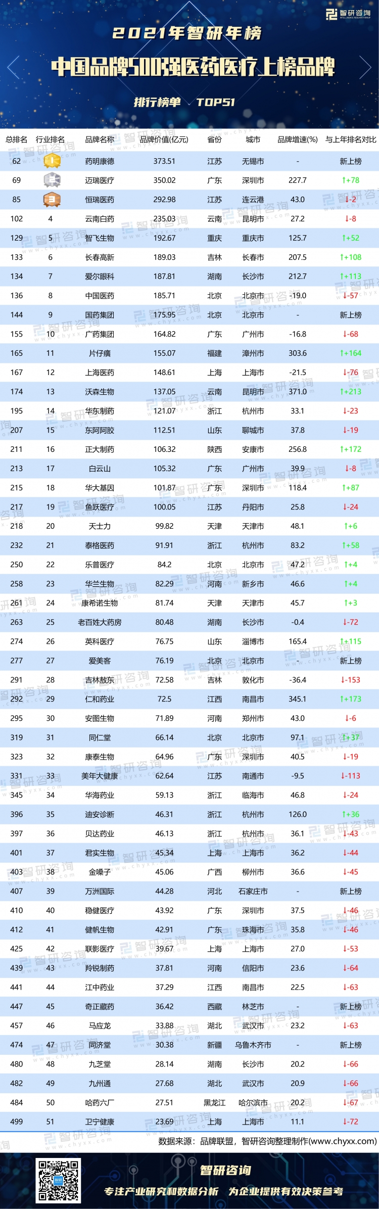 2021中國品牌500強(qiáng)累計品牌價值約為12.97萬億元,比上年上榜的500強(qiáng)增幅12.3%,入圍門檻由8.19億元提高到了23.54億元。500強(qiáng)品牌涵蓋了37個行業(yè),醫(yī)藥醫(yī)療以51個品牌上榜數(shù)領(lǐng)先于其他行業(yè)。