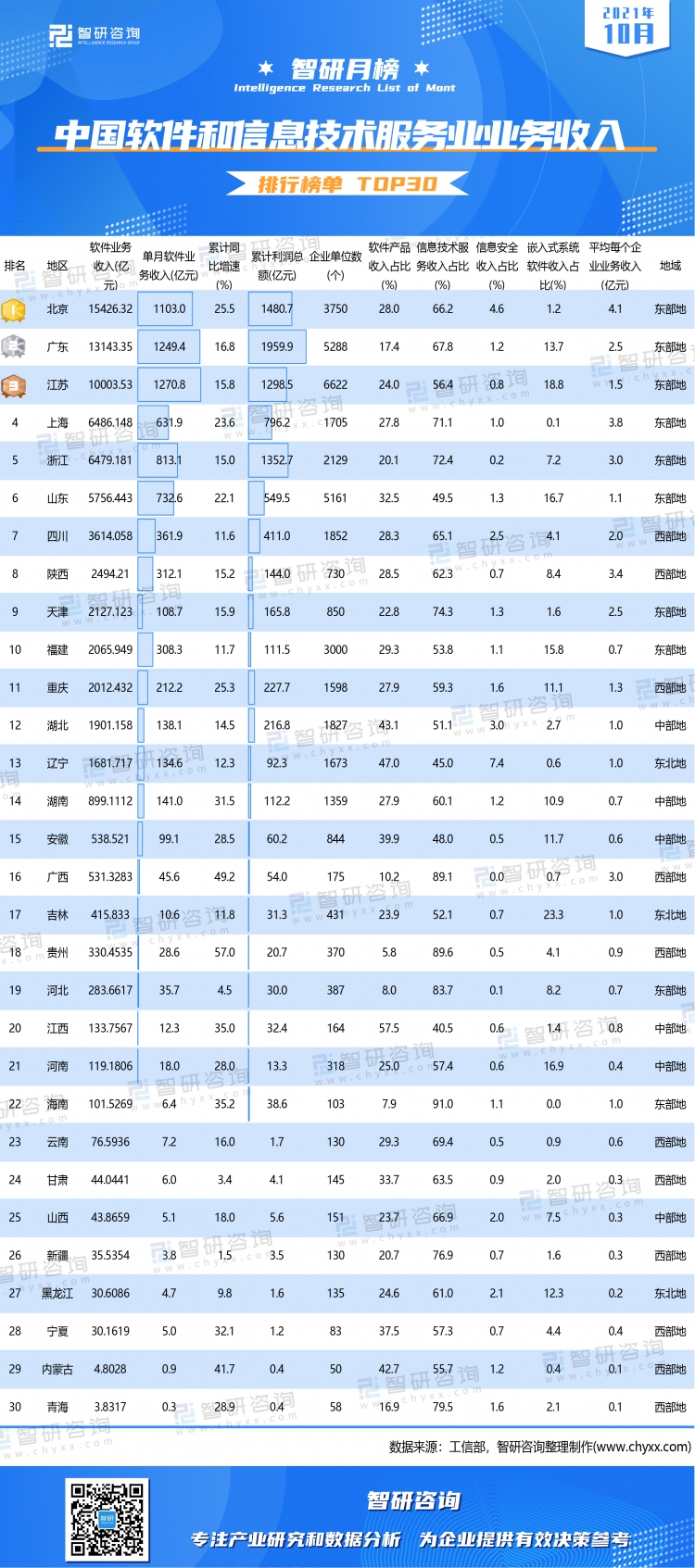 2021年1-10月北京軟件業務收入以15426.32億元的成績蟬聯榜首,廣東排名第二,江蘇1-10月累計軟件業務收入突破萬億大關,10個省份1-10月軟件業務收入在1000-10000億元之間,8個省份1-10月軟件業務收入不足百億元,其中就包括累計軟件業務收入低于5億元的內蒙古和青海;Top前三的省份單月軟件業務收入超過千億元,青海單月軟件業務收入最低,僅0.28億元。