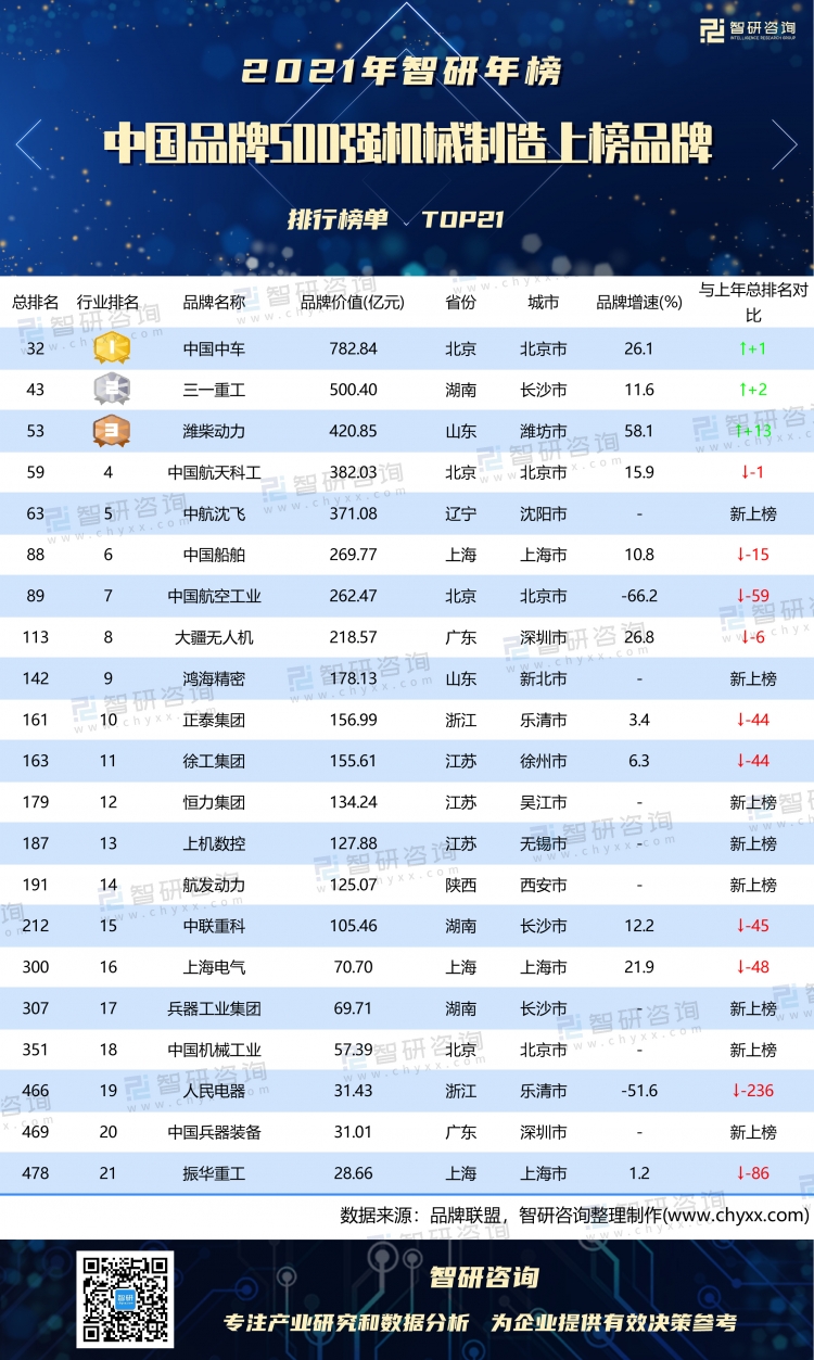 2021中國品牌500強機械制造上榜品牌排行榜:7個品牌排進總榜單前100名,北京上榜品牌最多(附年榜TOP21詳單)