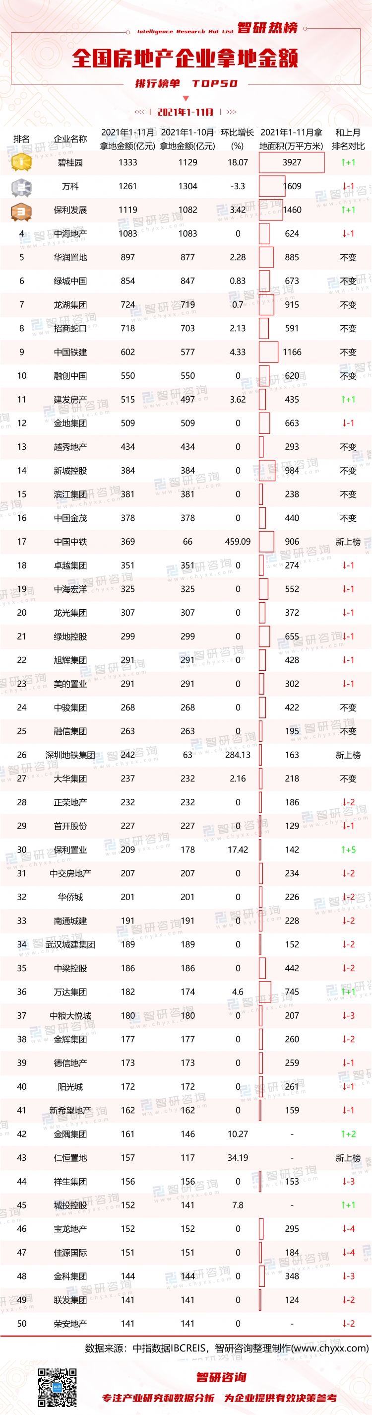 2021年1-11月50家企業累計權益拿地金額1.90萬億元,拿地面積超2.47億平方米;入圍門檻由上月的127億元提高11.02%升至141億元。