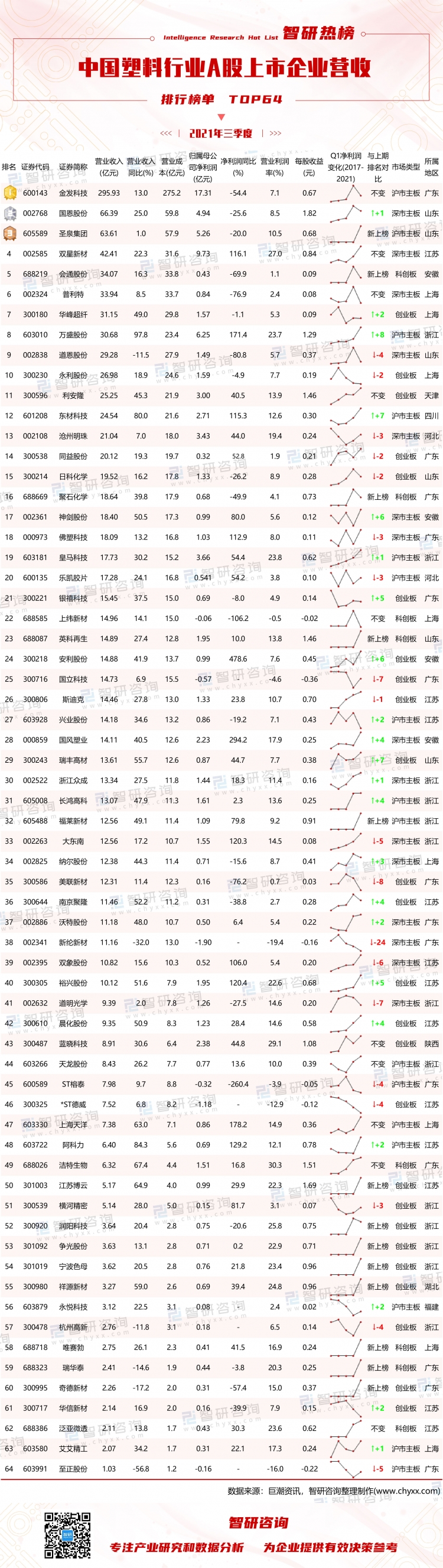 2021年三季度中國(guó)塑料上市企業(yè)TOP64榜單中,金發(fā)科技營(yíng)收約為295.9億元,營(yíng)收同比增長(zhǎng)13%,占整個(gè)塑料行業(yè)上市企業(yè)總營(yíng)收的23.98%,再度蟬聯(lián)榜單TOP1。58家企業(yè)營(yíng)收同比呈現(xiàn)不同程度增長(zhǎng),萬(wàn)盛股份同比增長(zhǎng)幅度最大(97.8%),6家企業(yè)營(yíng)收同比有所下滑,至正股份下降幅度最大(56.8%)。就榜單營(yíng)收與2020年三季度排名變化情況來(lái)看,22家企業(yè)排名有所上升,萬(wàn)盛股份上升了8名(最大),19家企業(yè)排名有所下降,新綸新材從14名下降到了38名,下降名次最多,10家企業(yè)排名未發(fā)生變化。13家企業(yè)新上榜,新上榜的圣泉集團(tuán)業(yè)績(jī)表現(xiàn)良好,排名第3位。