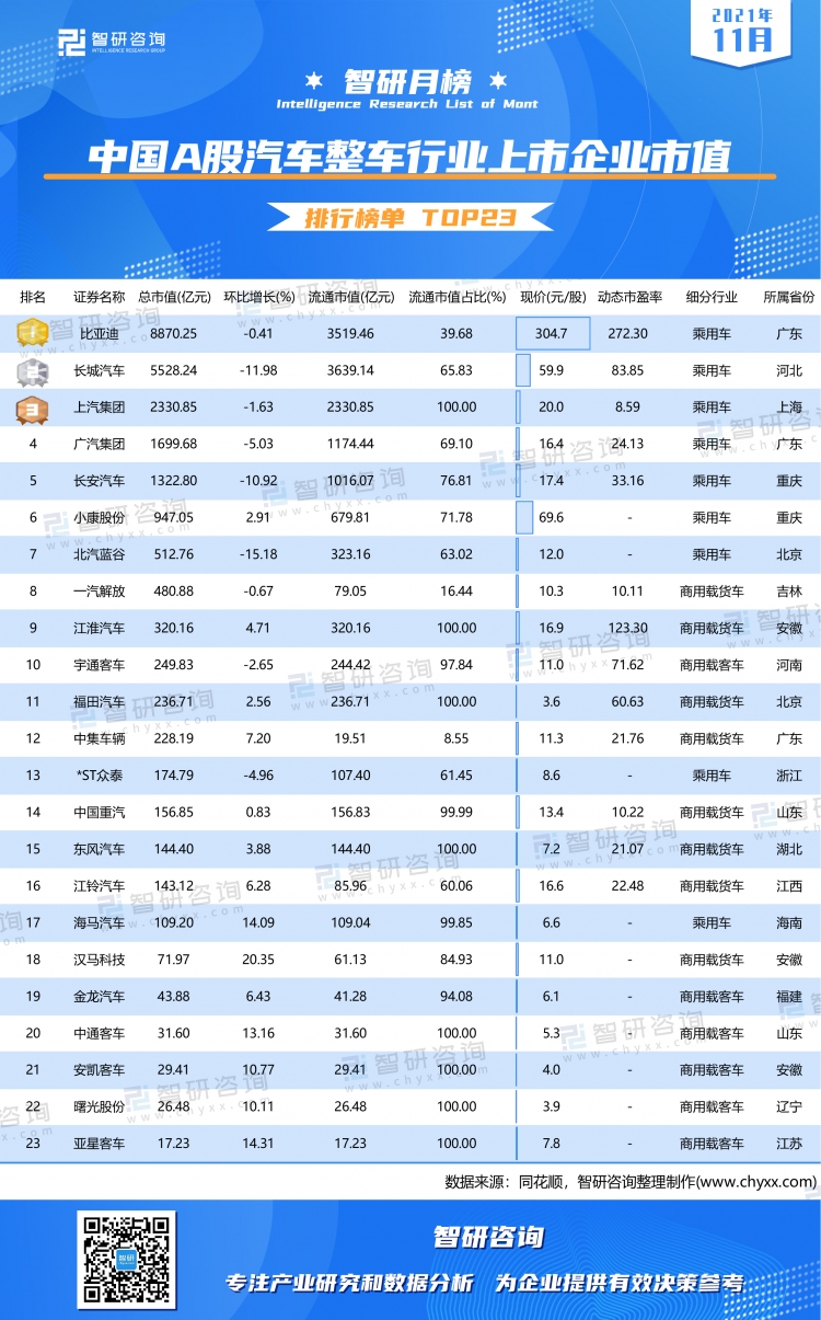 汽車整車行業共有23家企業已在A股上市,其中包括9家乘用車企業和14家商用車企業,14家商用車企業分為8家商用載貨車企業和6家商用載客車;23家企業總市值共計2.36萬億元,較上月的2.48萬億元減少4.34%,流通市值共計1.44萬億元,較上月的1.51萬億元減少4.69%;從市值排名而言,23家企業排名均未發生改變。