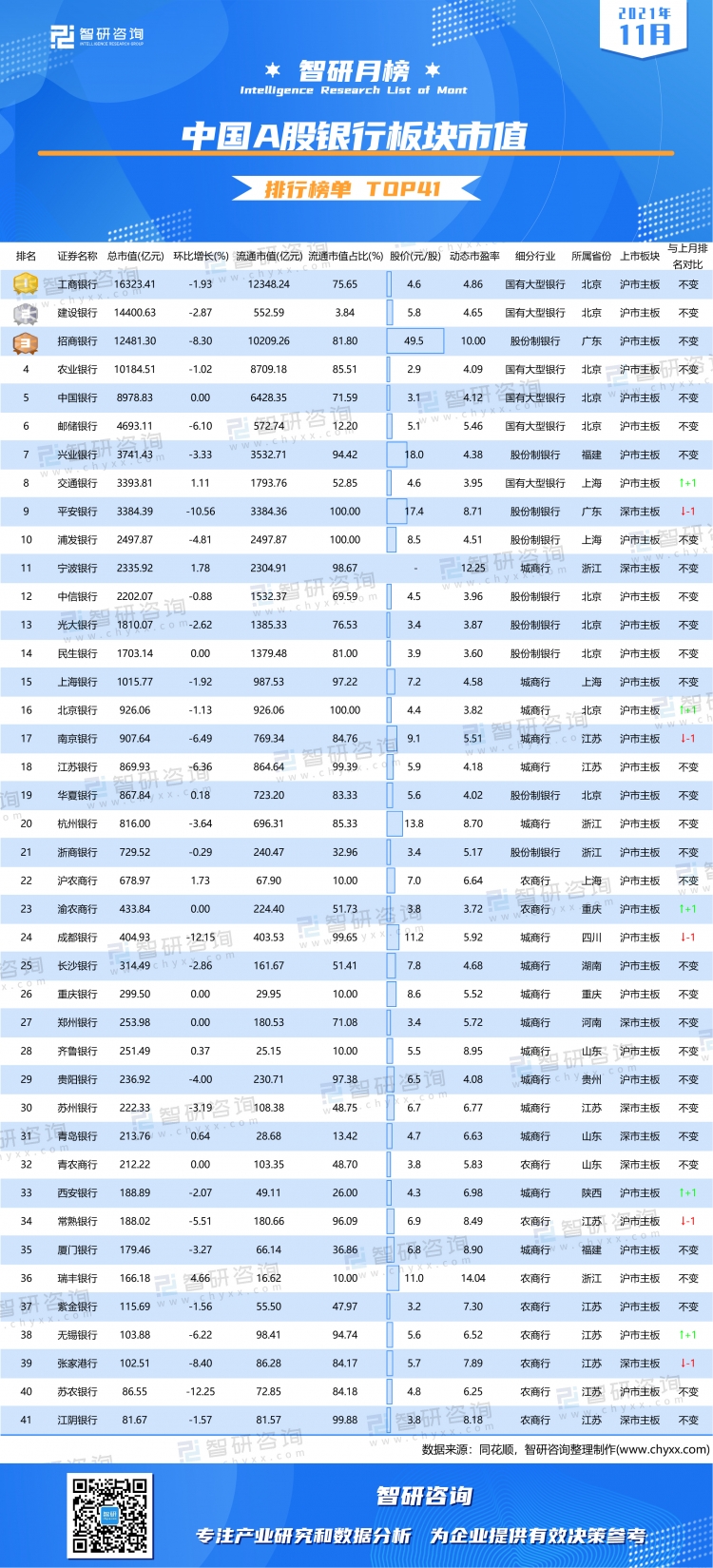 與10月市值相比,交通銀行、寧波銀行等7家銀行市值增加,瑞豐銀行增幅最大,較上月增長4.66%,寧波銀行增量最大,市值增加40.85億元,此外滬農商行和交通銀行市值均增加超過10億元;中國銀行、民生銀行、渝農商行、重慶銀行、鄭州銀行、青農商行6家銀行市值無明顯變化;28家銀行市值減少,平安銀行、成都銀行、蘇農銀行市值均較上月減少超過10%,招商銀行減量最大,市值減少1129.85億元。