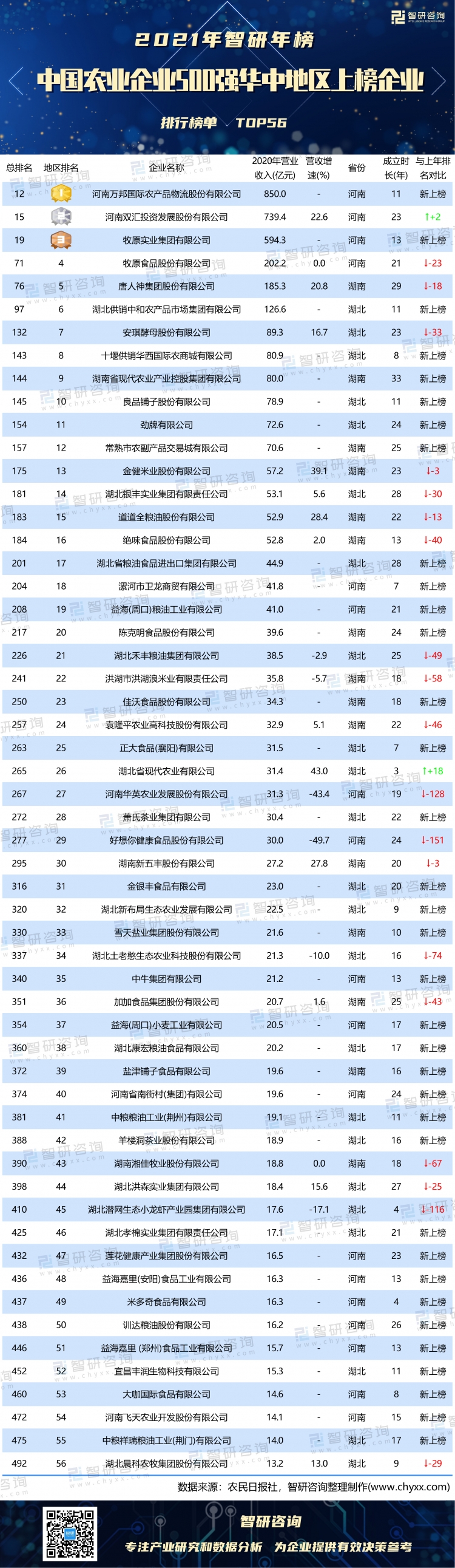 近日,農民日報社發起第五屆中國農業企業500強評價活動,經信息匯集、嚴格審核、專家評議等程序,形成了《2021(第五屆)中國農業企業500強榜單》,榜單參照國際通行評價辦法,由企業按照要求進行申報或采用公開數據,依據2020年農業企業營業收入排序產生,智研咨詢數據中心據此推出《智研年榜:2021中國農業企業500強華中地區上榜企業排行榜單TOP56》,以供參考。