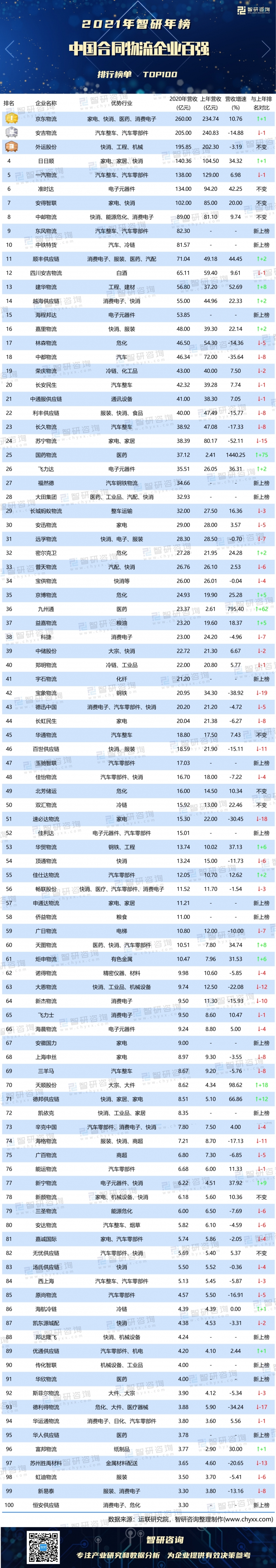 依據榜單可知,京東物流、安吉物流、外運股份、日日順、一汽物流、準時達、安得智聯、中郵物流這8家合同物流企業穩居榜單前8,排名與上年榜單相比,京東物流從第2名上升到第一名,安吉物流下滑到第2名,日日順與一汽物流也互換了名次,其他4家排名保持不變。