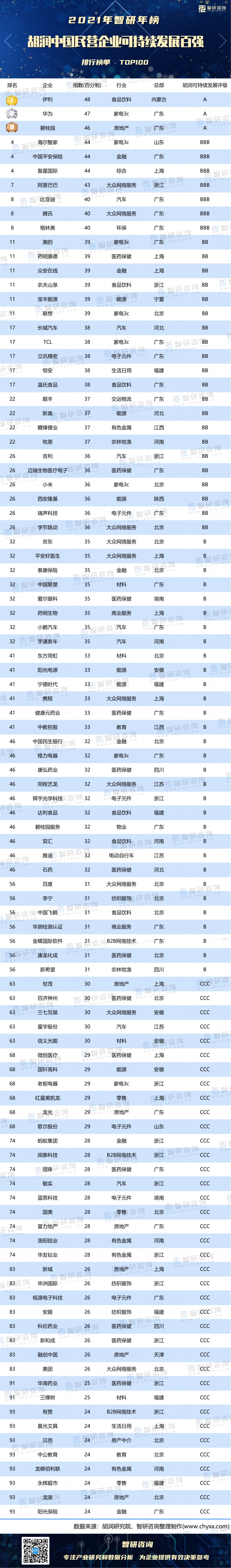 2021年胡潤中國民營企業可持續發展百強排行榜:伊利位居榜首,華為位居第2(附年榜TOP100詳單)