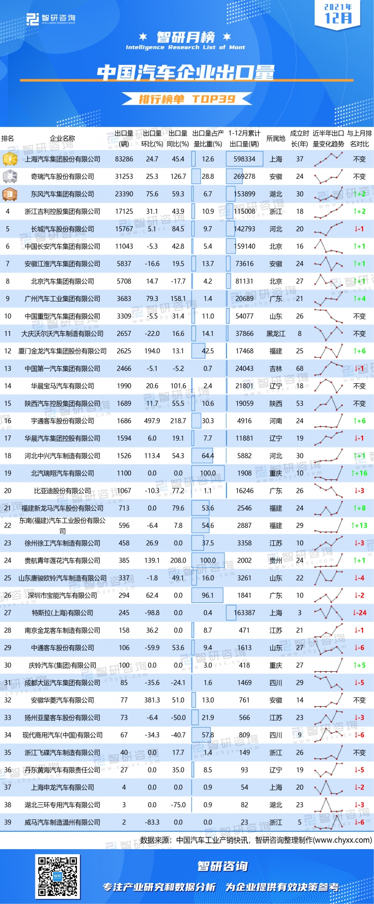 2021年12月,中國98家汽車企業共生產汽車2907173輛,其中51家企業累計出口222571輛,出口量占總產量的7.7%。12月只有39家汽車企業有出口量,出口量環比增長11.44%,同比增長54.03%,2021年1-12月有45家汽車企業有出口量,累計出口2015220輛汽車。